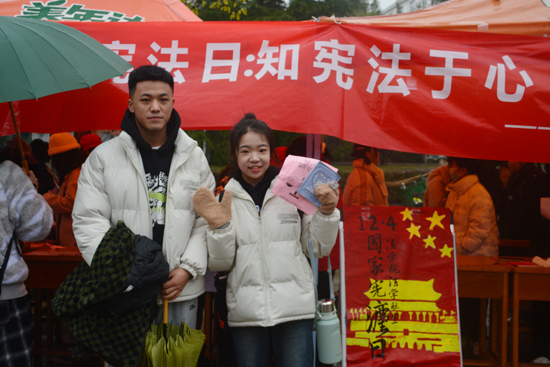 活动现场,志愿者向往来师生发放精心制作的宪法宣传资料,向大家宣传国家宪法日的由来、宪法法律知识及党的二十大精神。在法律咨询台,志愿者为前来咨询的同学们答疑解惑、讲解法律知识。在闯关有奖竞答、签名留言、集体宪法宣誓环节,师生们踊跃参与,现场气氛十分热烈。